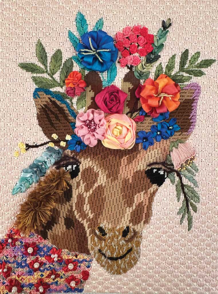 Giraffe with Flowers, Canvas by Kate Dickerson, Guide and Stitching by Marci Slotin and Jan Rogers, The Nimble Needle